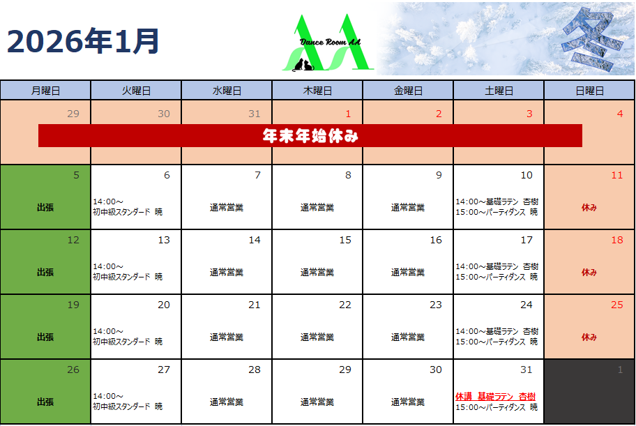 2026年1月団体クラススケジュール