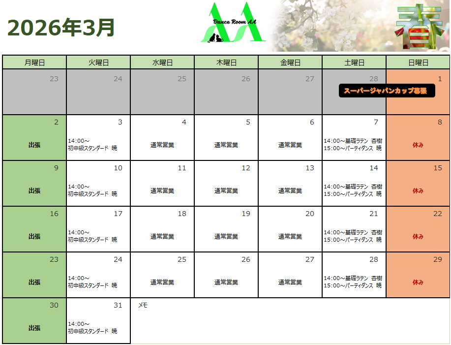 2026年3月団体クラススケジュール